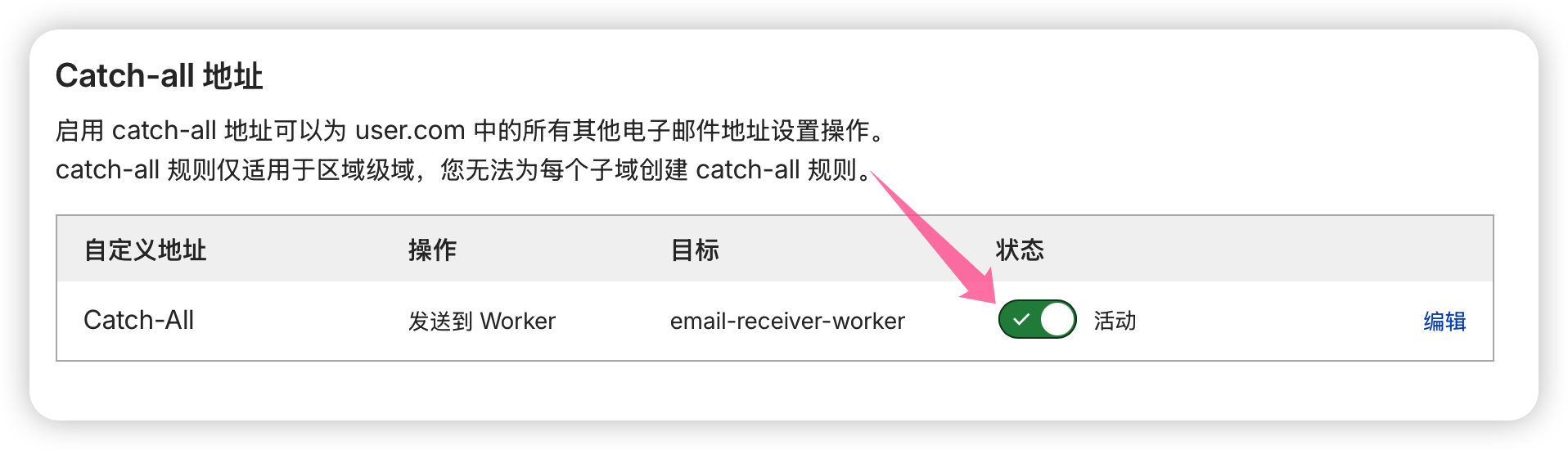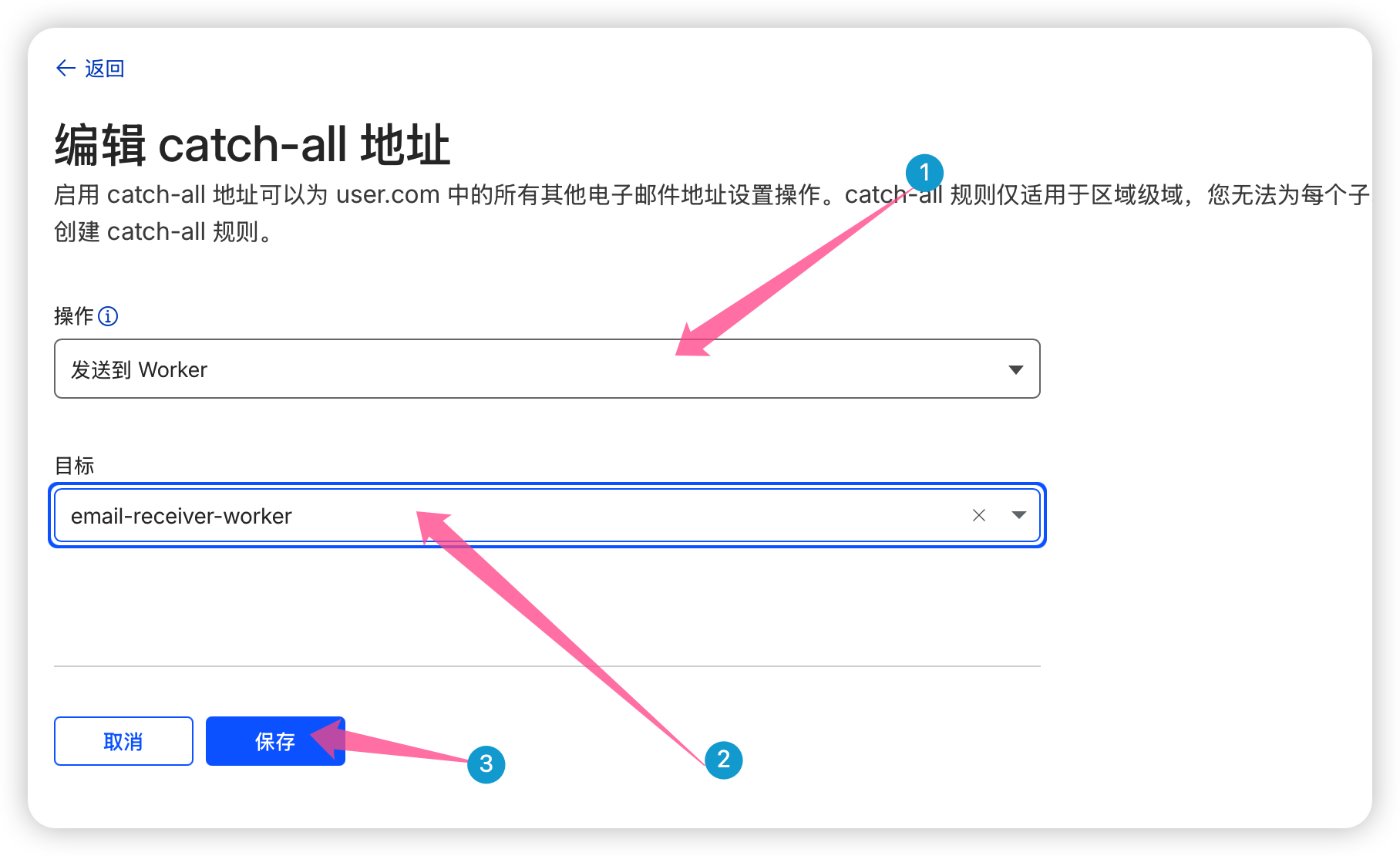 点路由规则编辑 Catch-all 地址→ 选择 "发送到 Worker"→目标 email-receiver-worker→点击"保存"