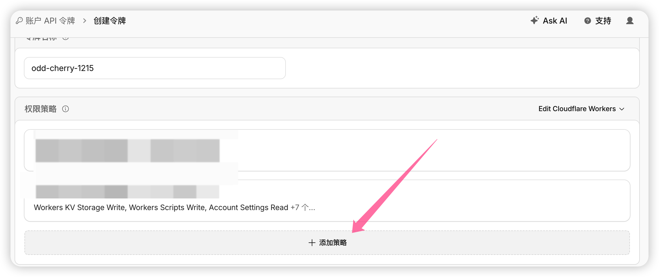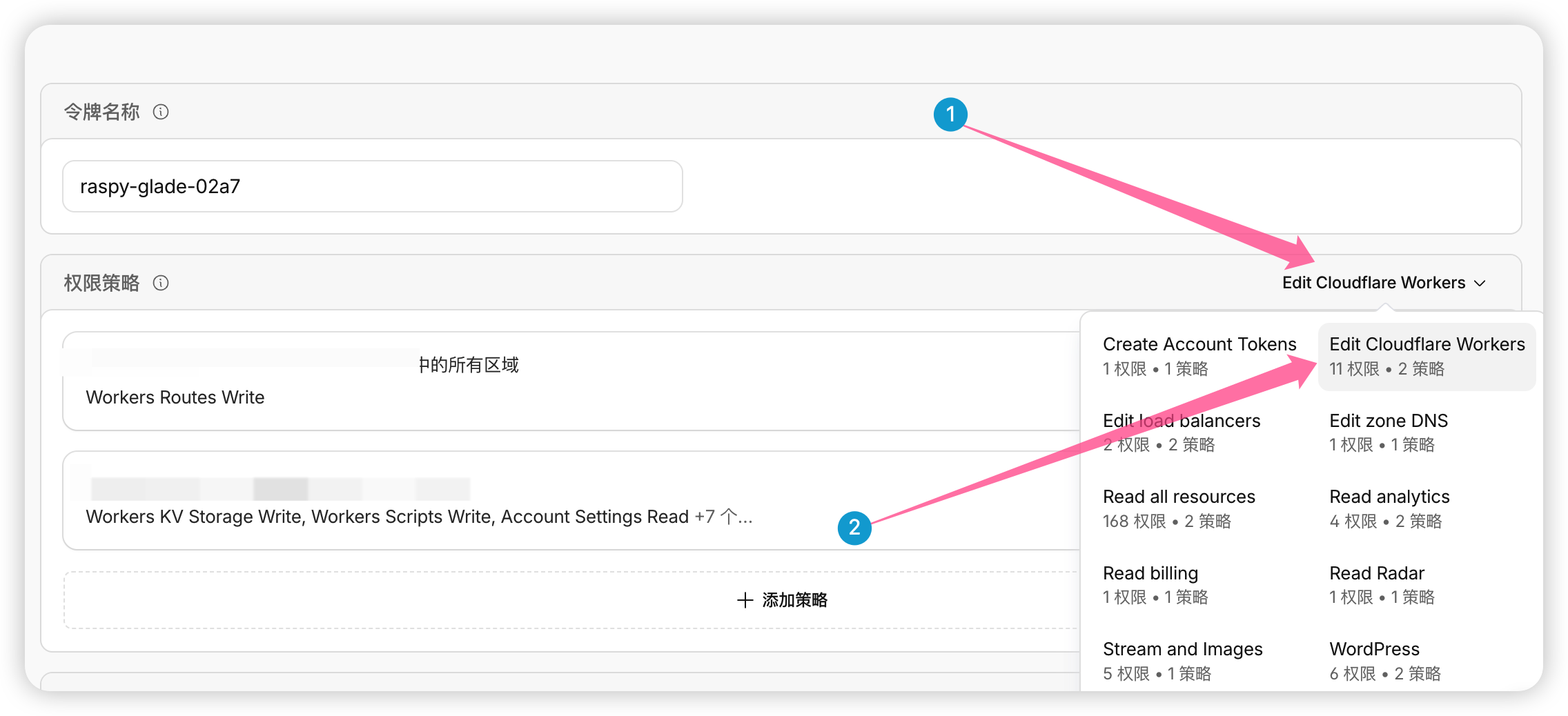 点击右侧权限策略→选择Edit Cloudflare Workers