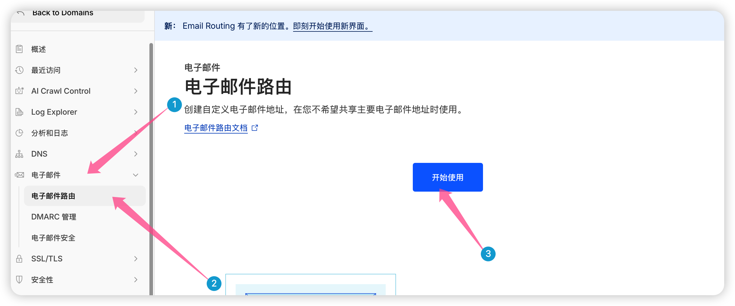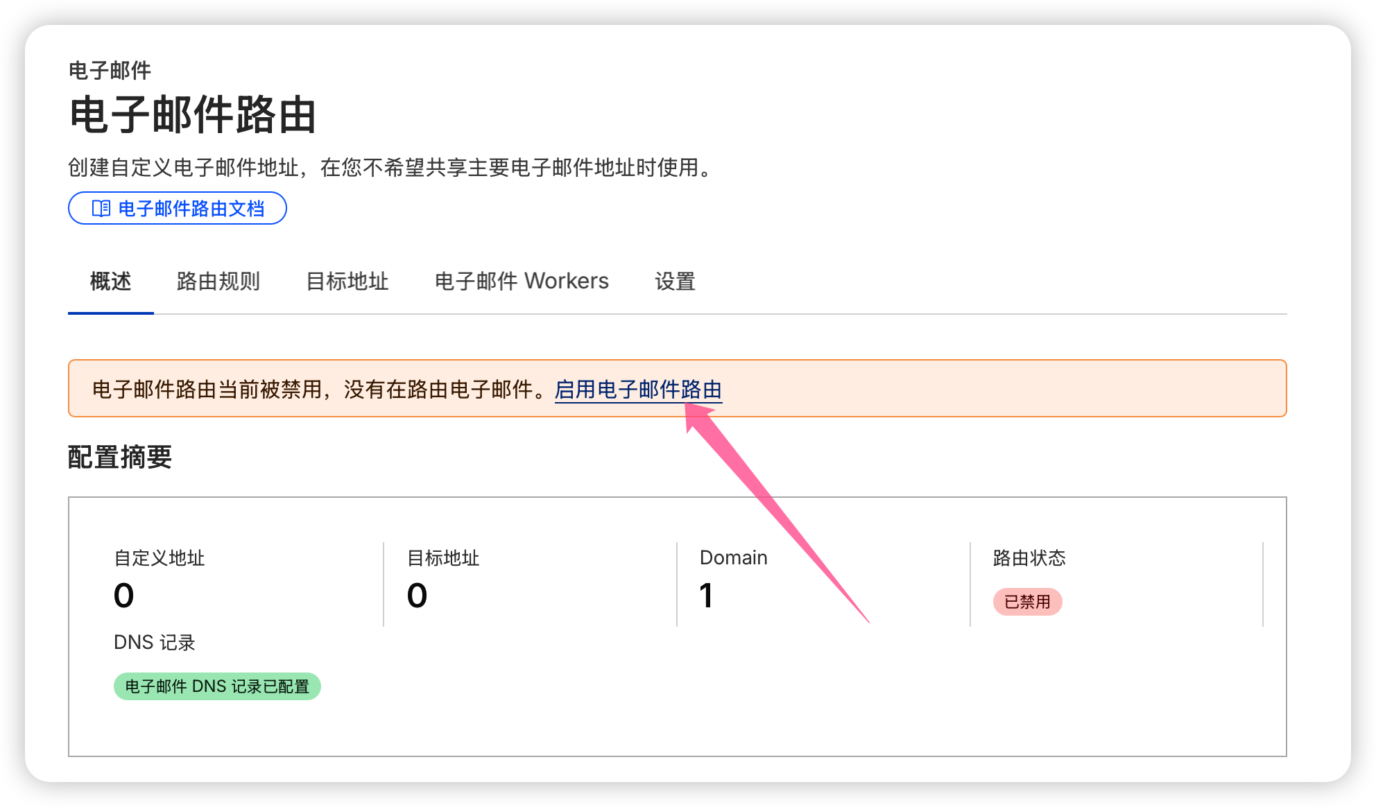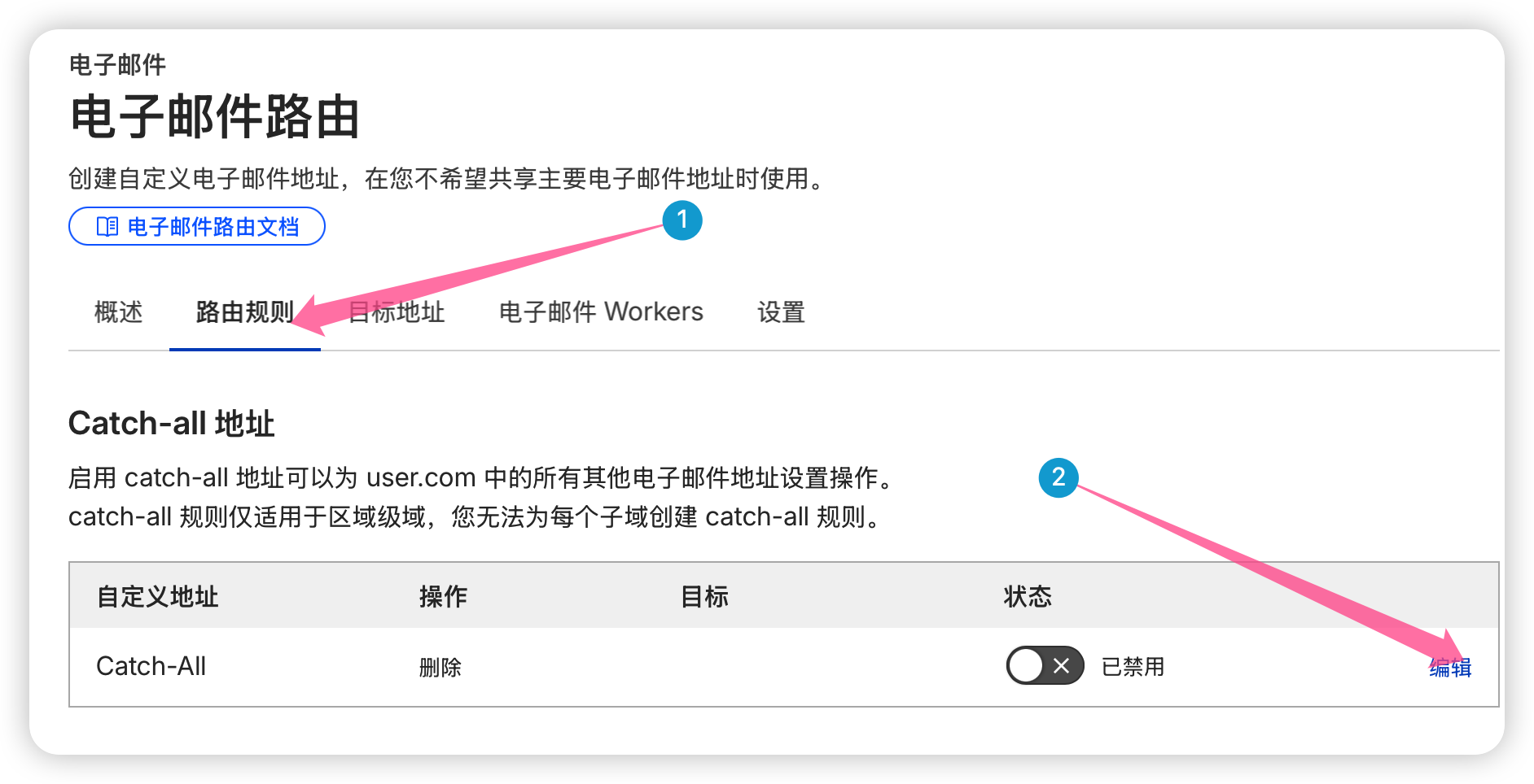 为了使邮箱域名生效,还需要在 Cloudflare 控制台配置邮件路由,将收到的邮件转发给 Email Worker 处理。