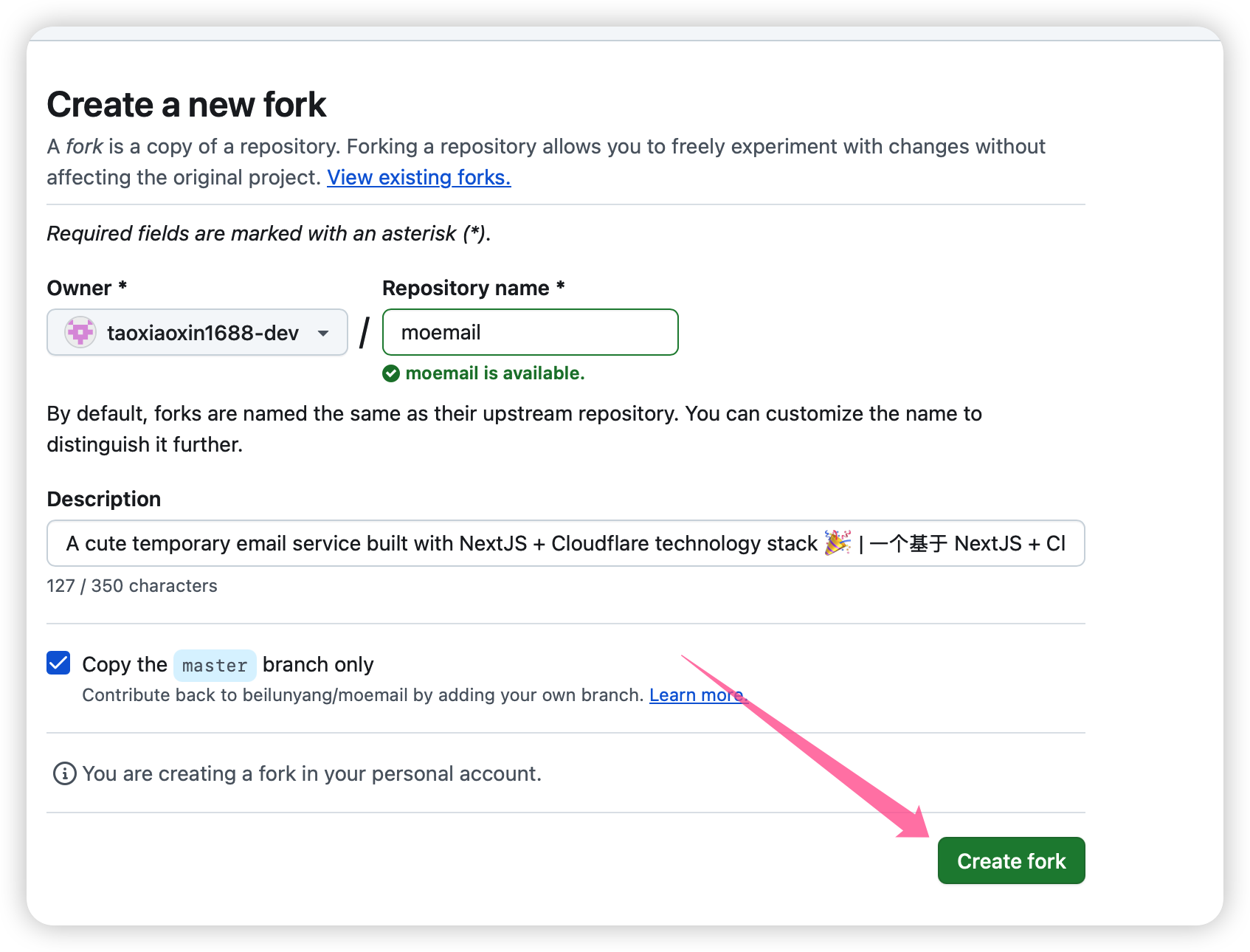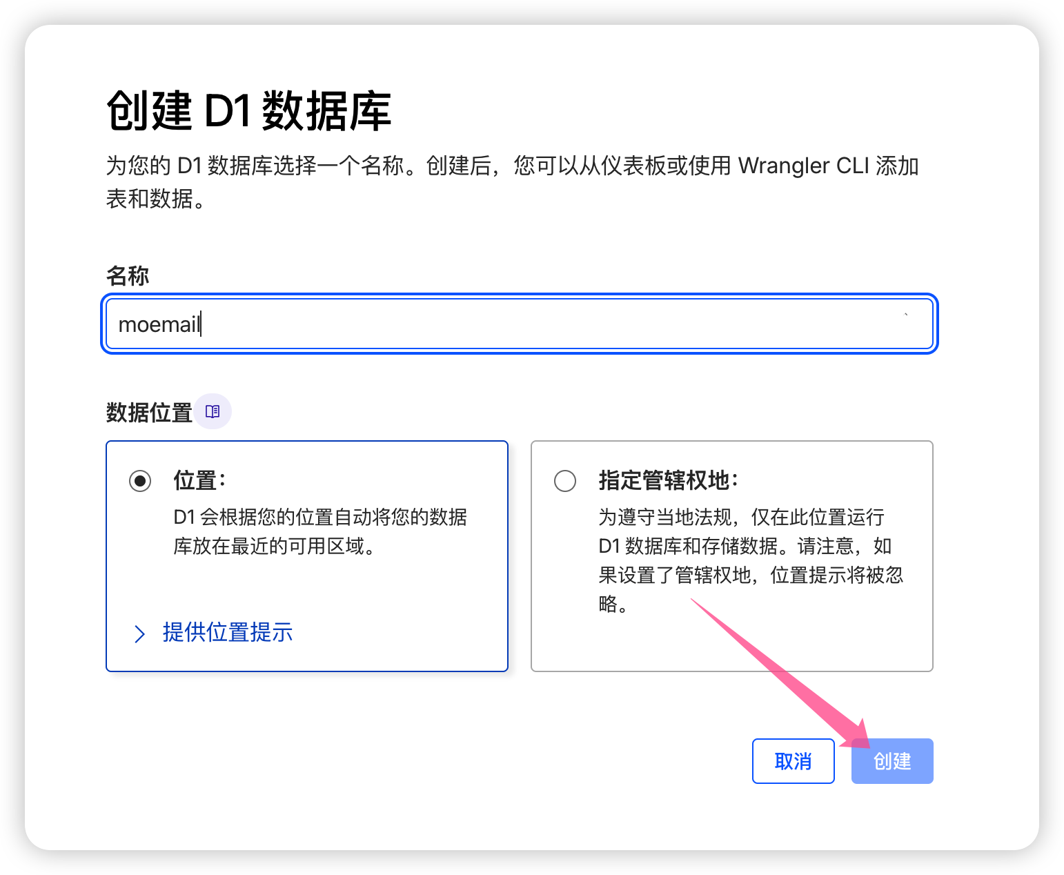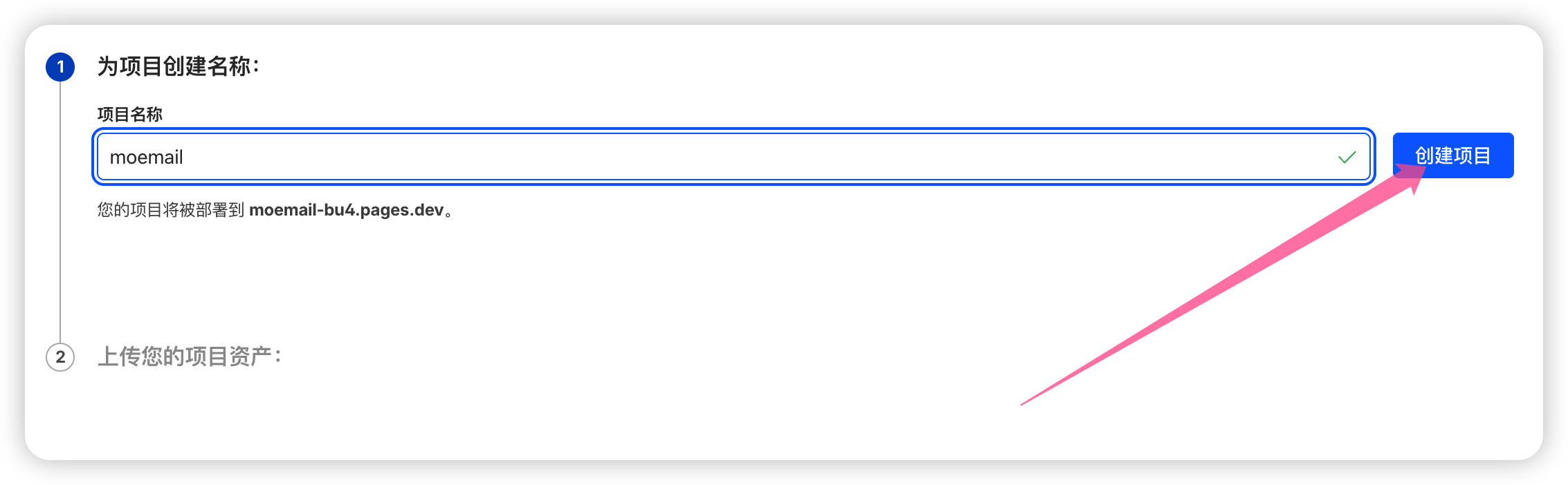 输入项目名称后,项目名称必须填写 moemail,否则无法正常部署,输入项目名称后,点击 “创建项目” 即可。