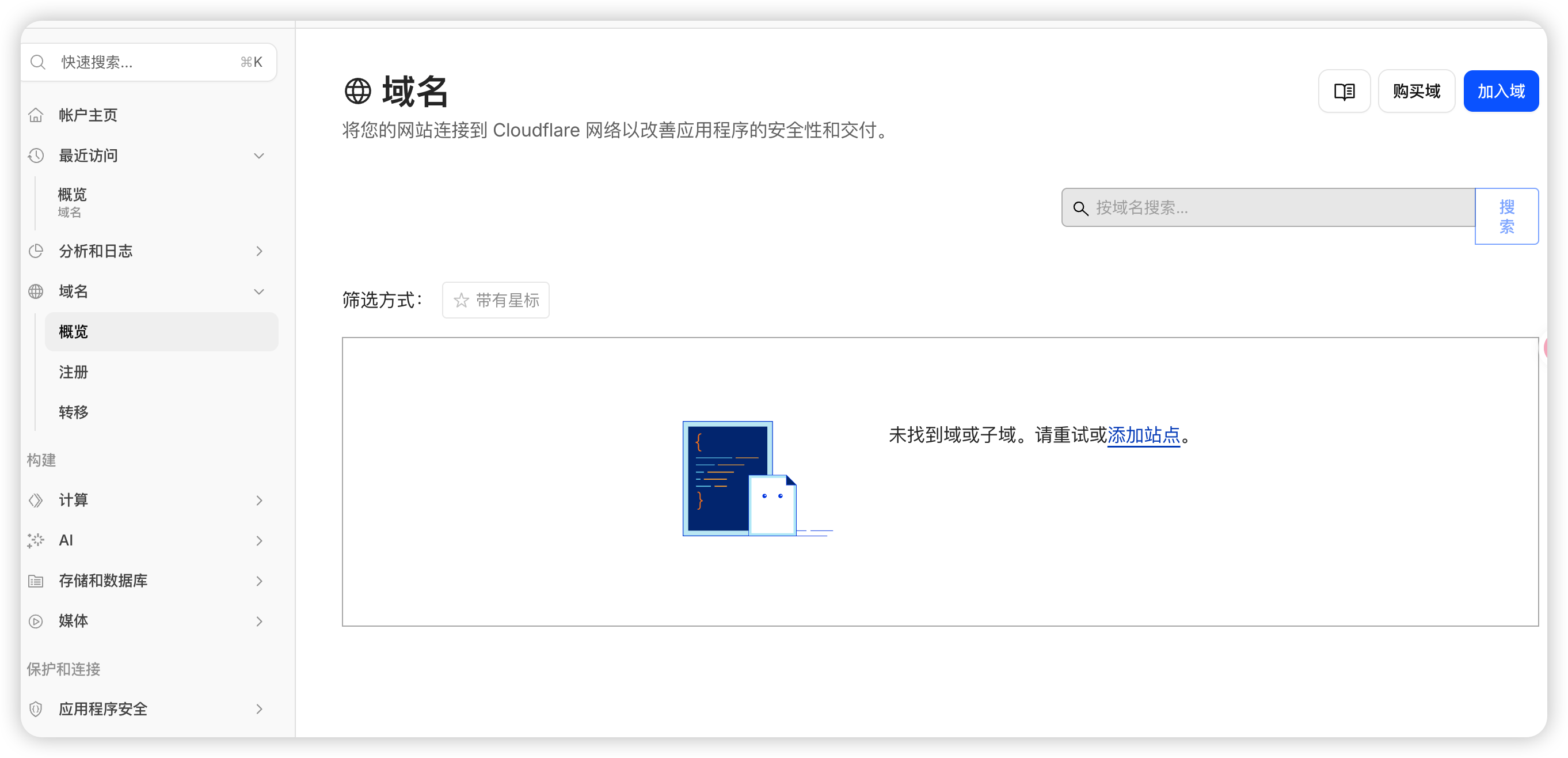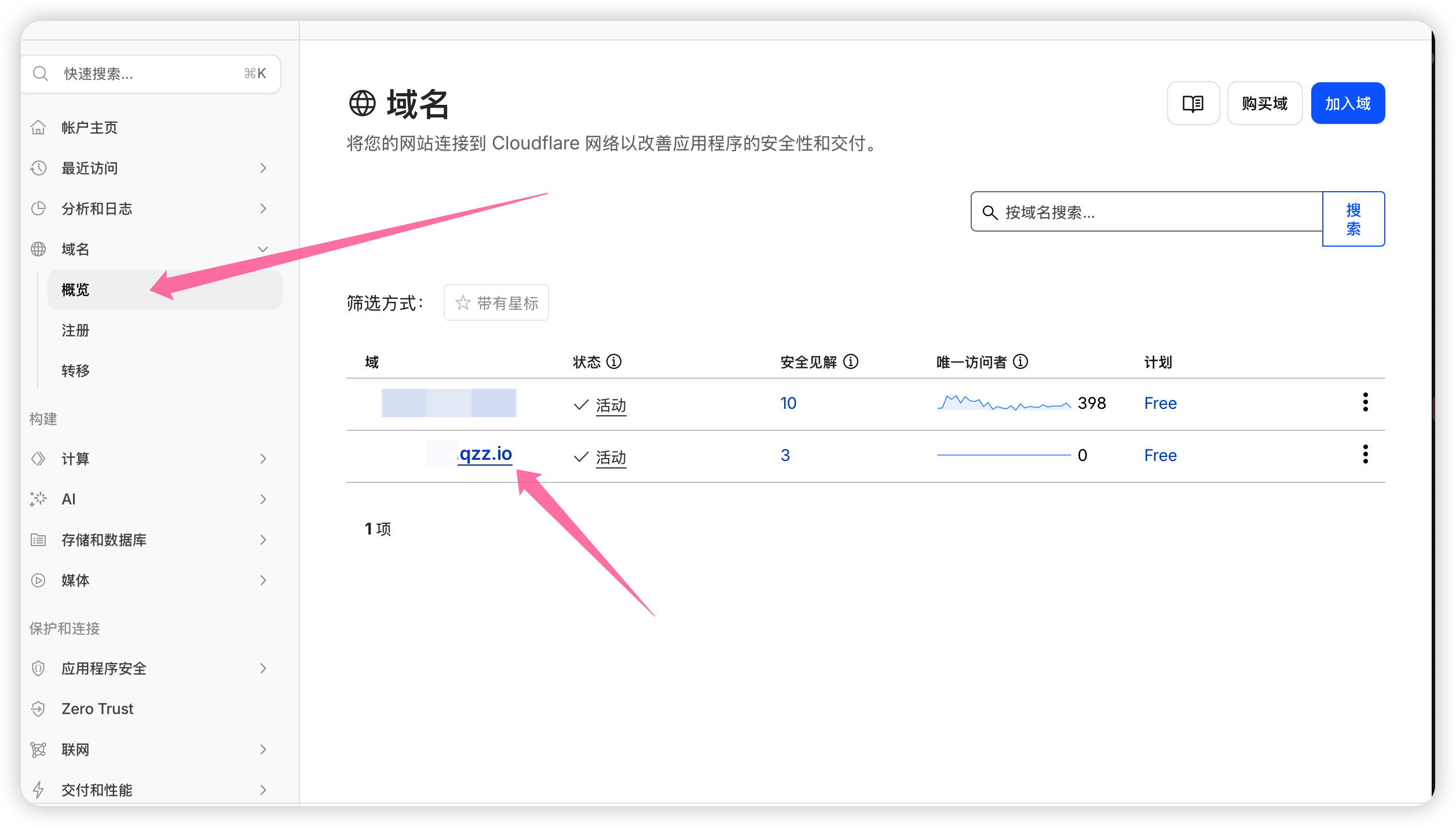 Cloudflare 注册完成、通过邮箱验证后,会直接跳转到面板页,点击域名—>概览—>加入域。