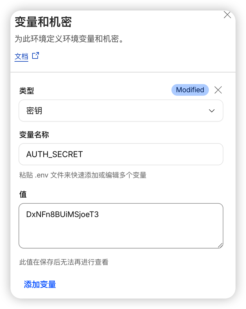 继续设置AUTH_SECRET: NextAuth Secret,用来加密 session,请设置一个随机字符串即可,可以随便填。
