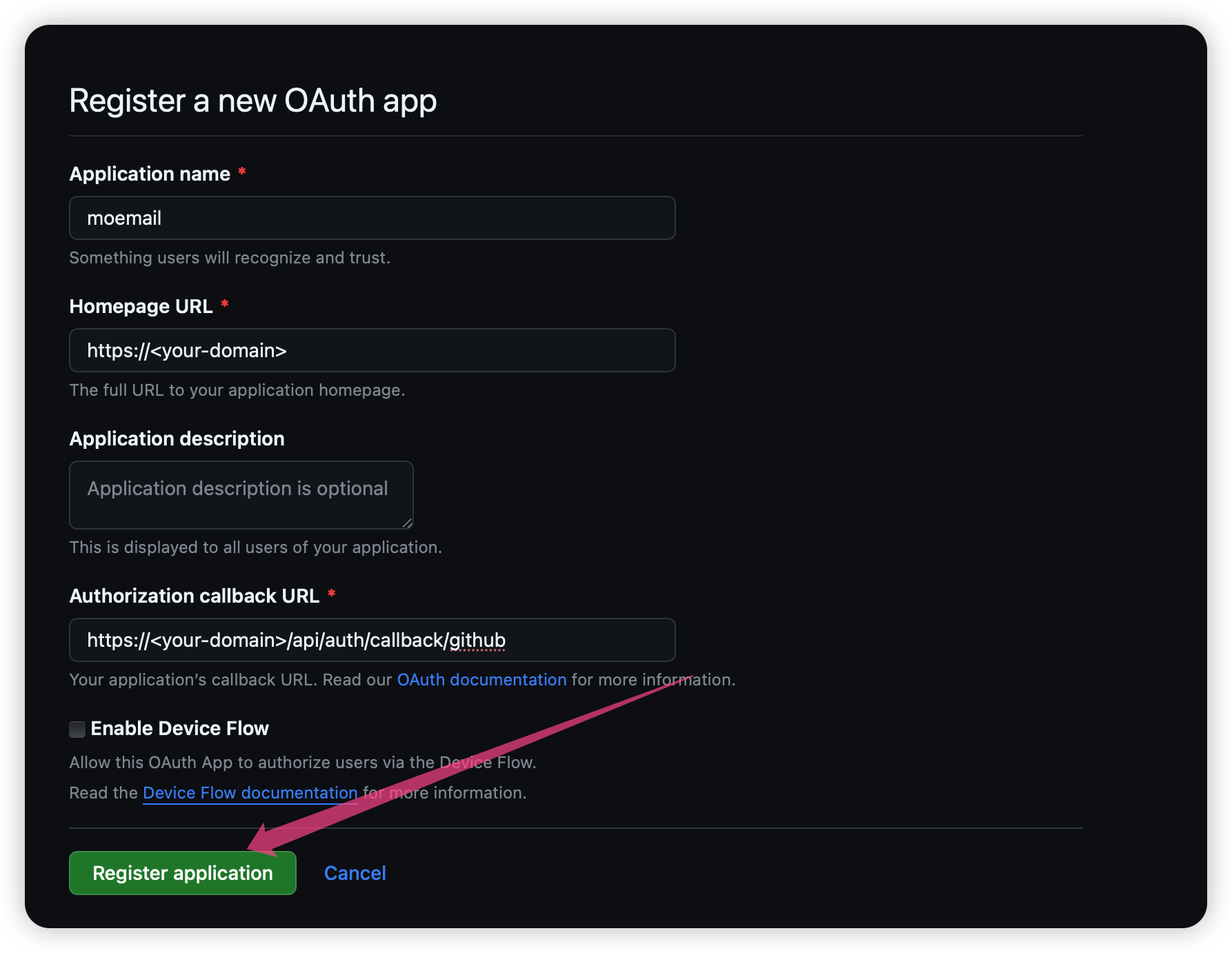 | Authorization callback URL | Github 认证地址,如:https://<your-domain>/api/auth/callback/github |