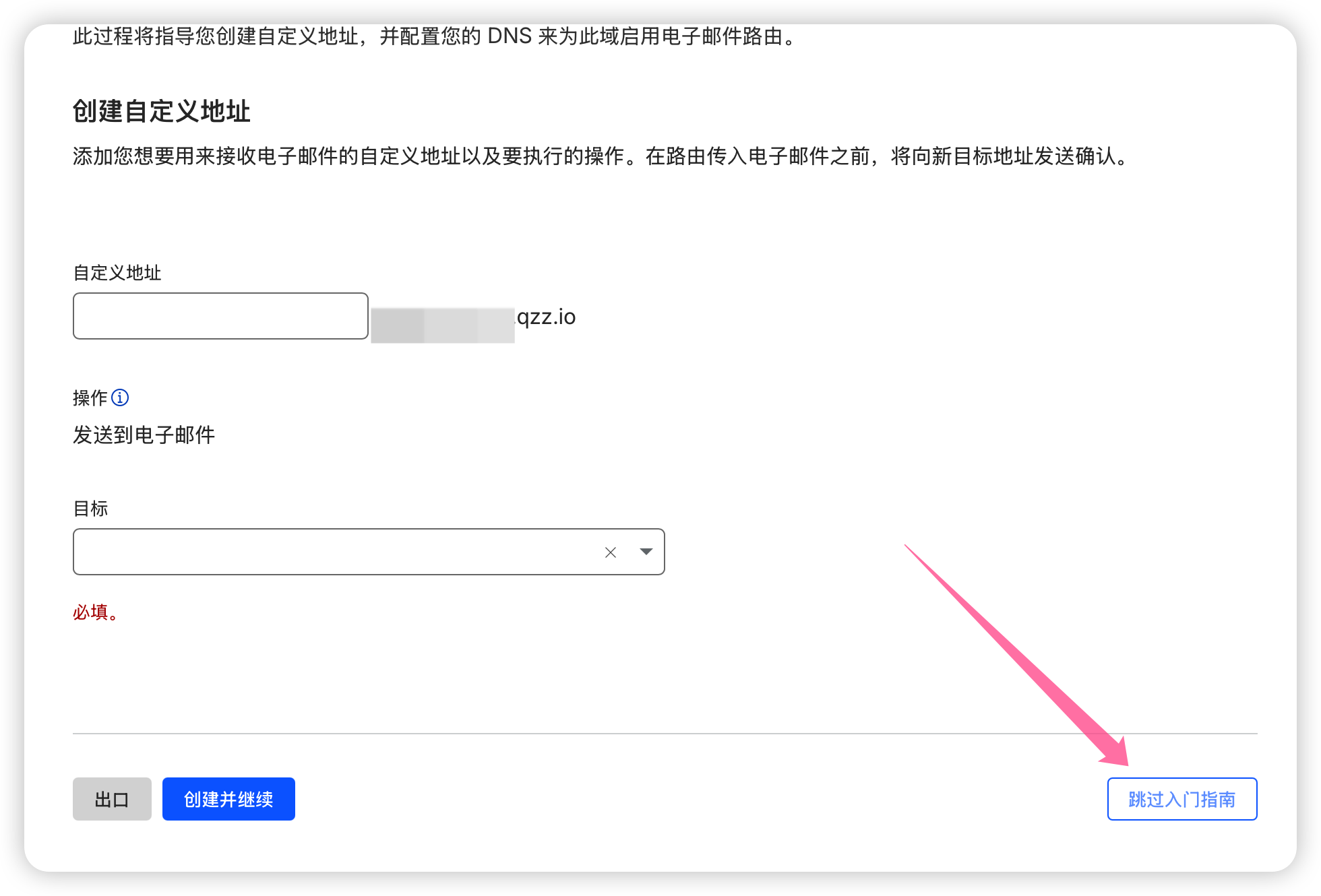 打开Cloudflare 控制台→选择的的域名→点击左侧菜单的 "电子邮件" -> "电子邮件路由" -> "跳过入门指南"