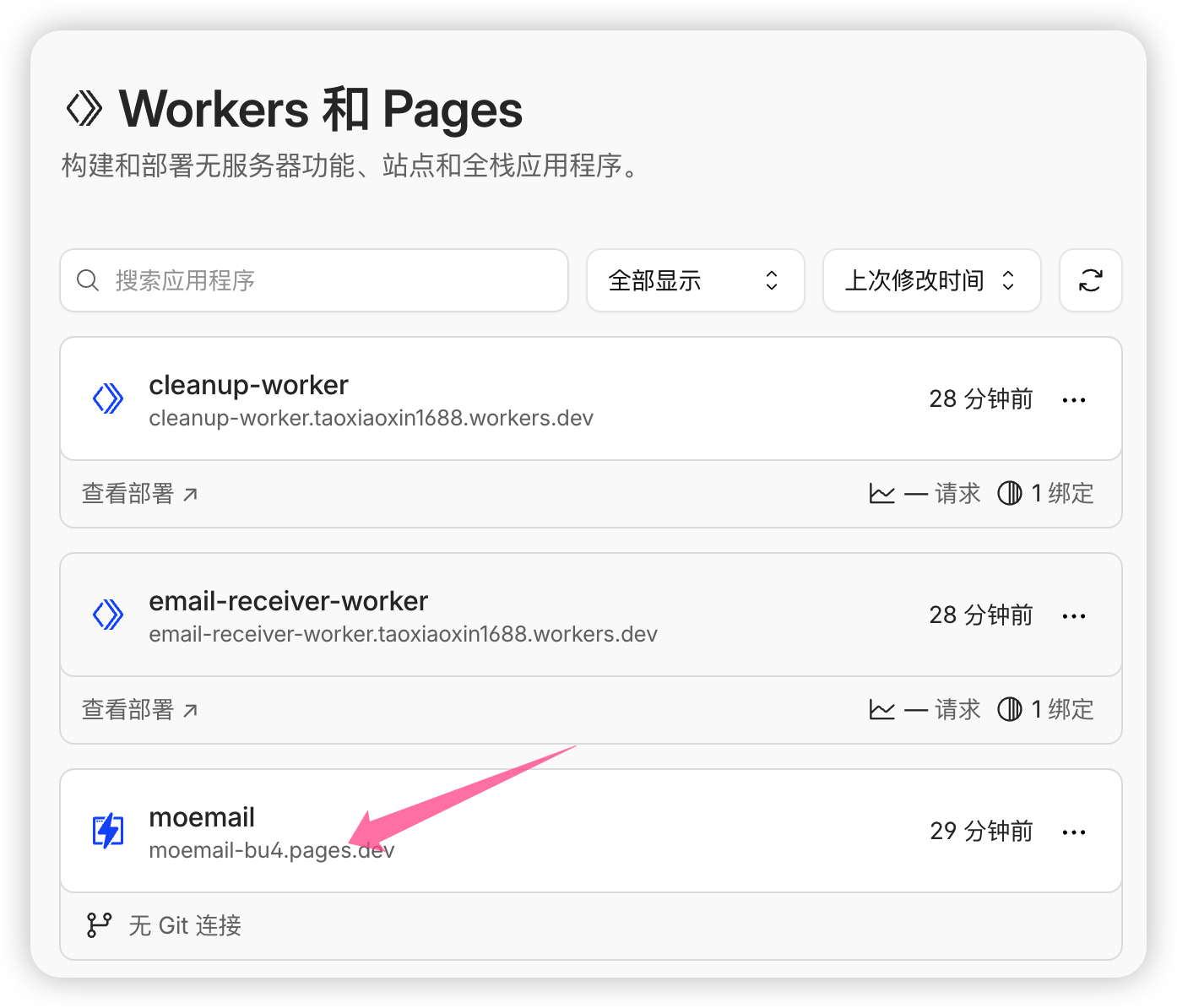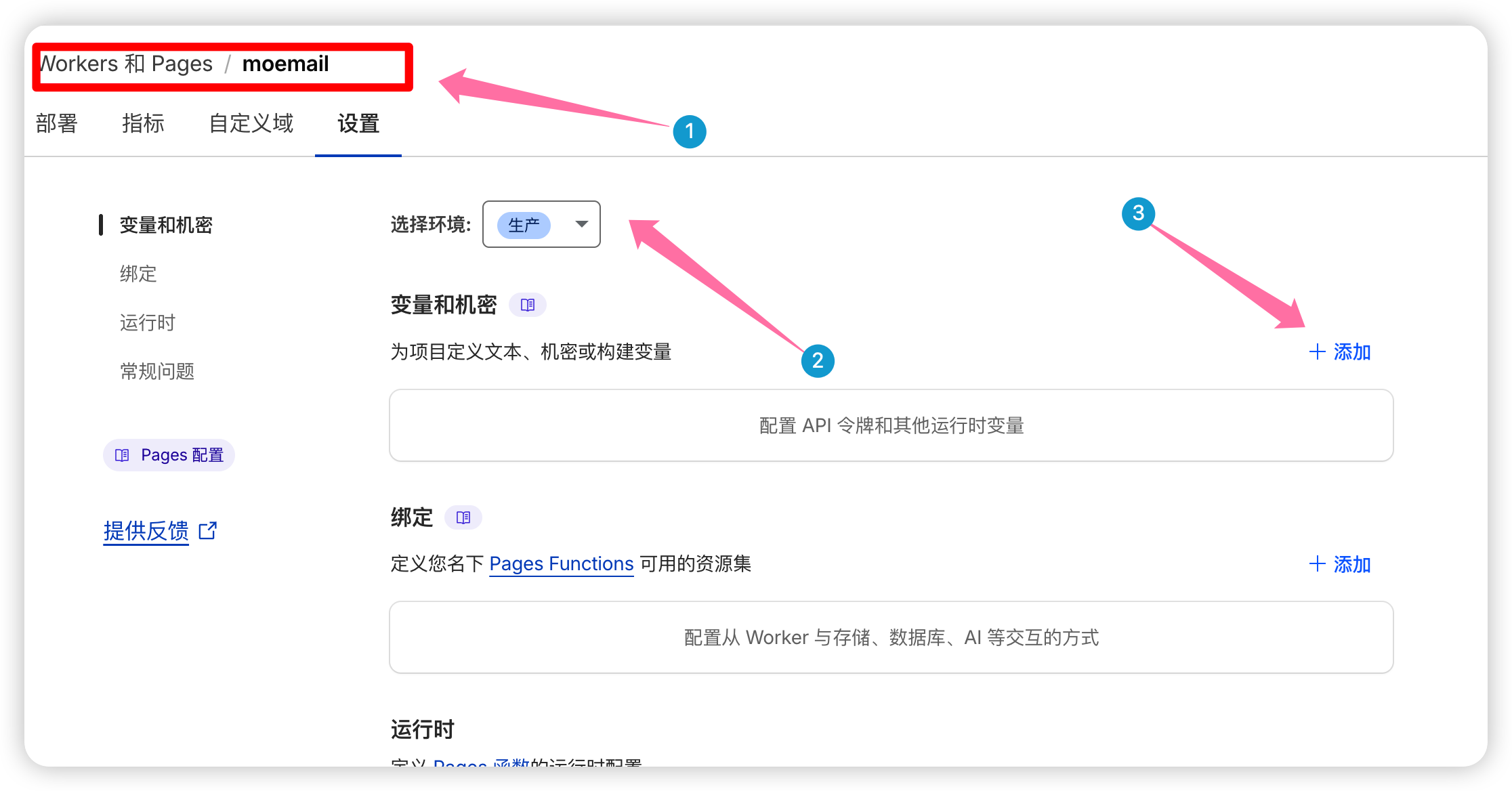 回到Workers 和 Pages →moemail 项目设置 →选择环境为为生产→点击添加