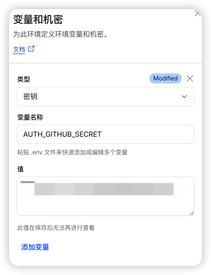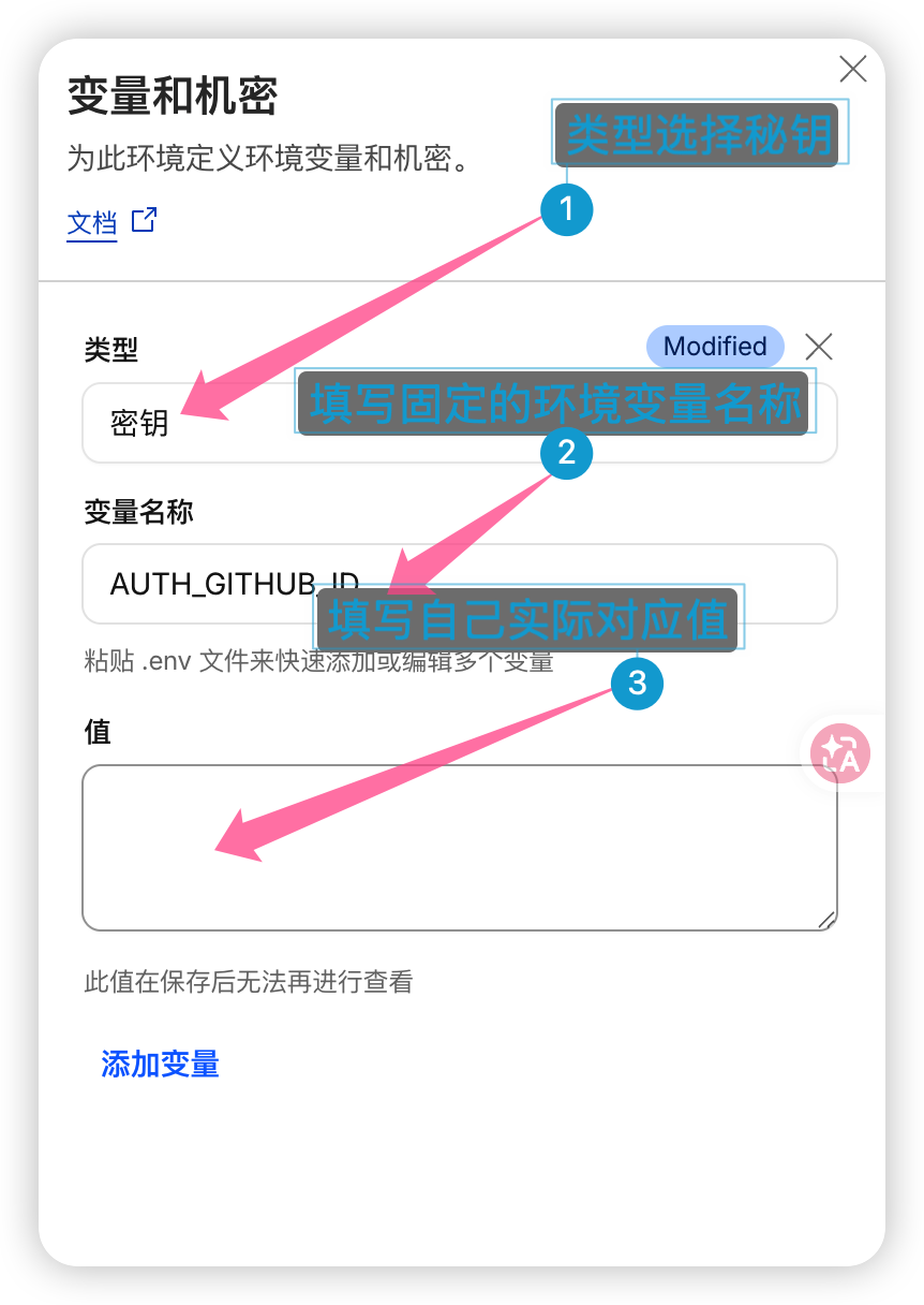 填写刚刚保存的Github Client ID以及Client secrets,类型选择秘钥,环境变量值名称如下: