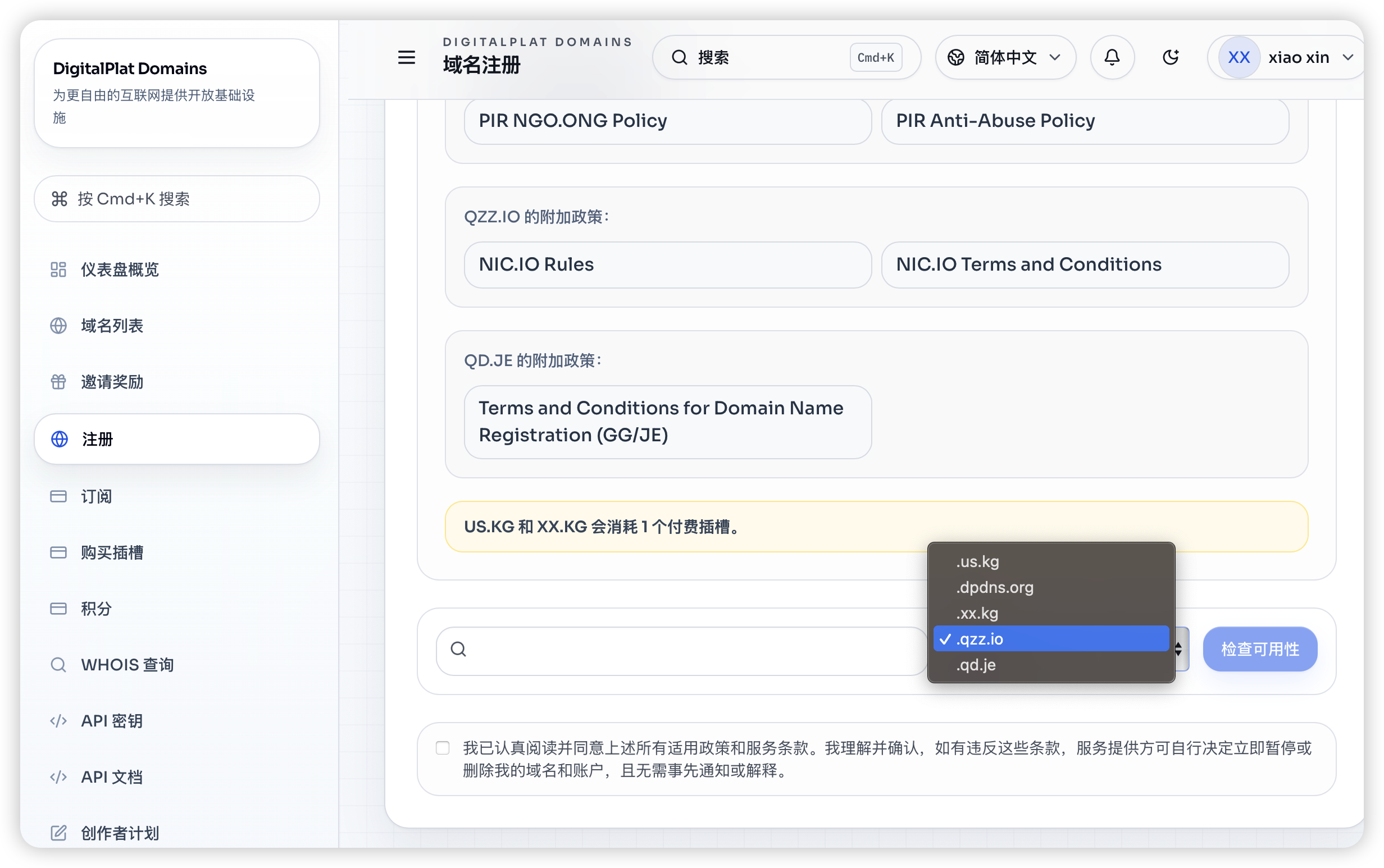 接着点击注册,这里我选择使用最短的.qzz.io域名后缀,输入你想要注册的子域名。
