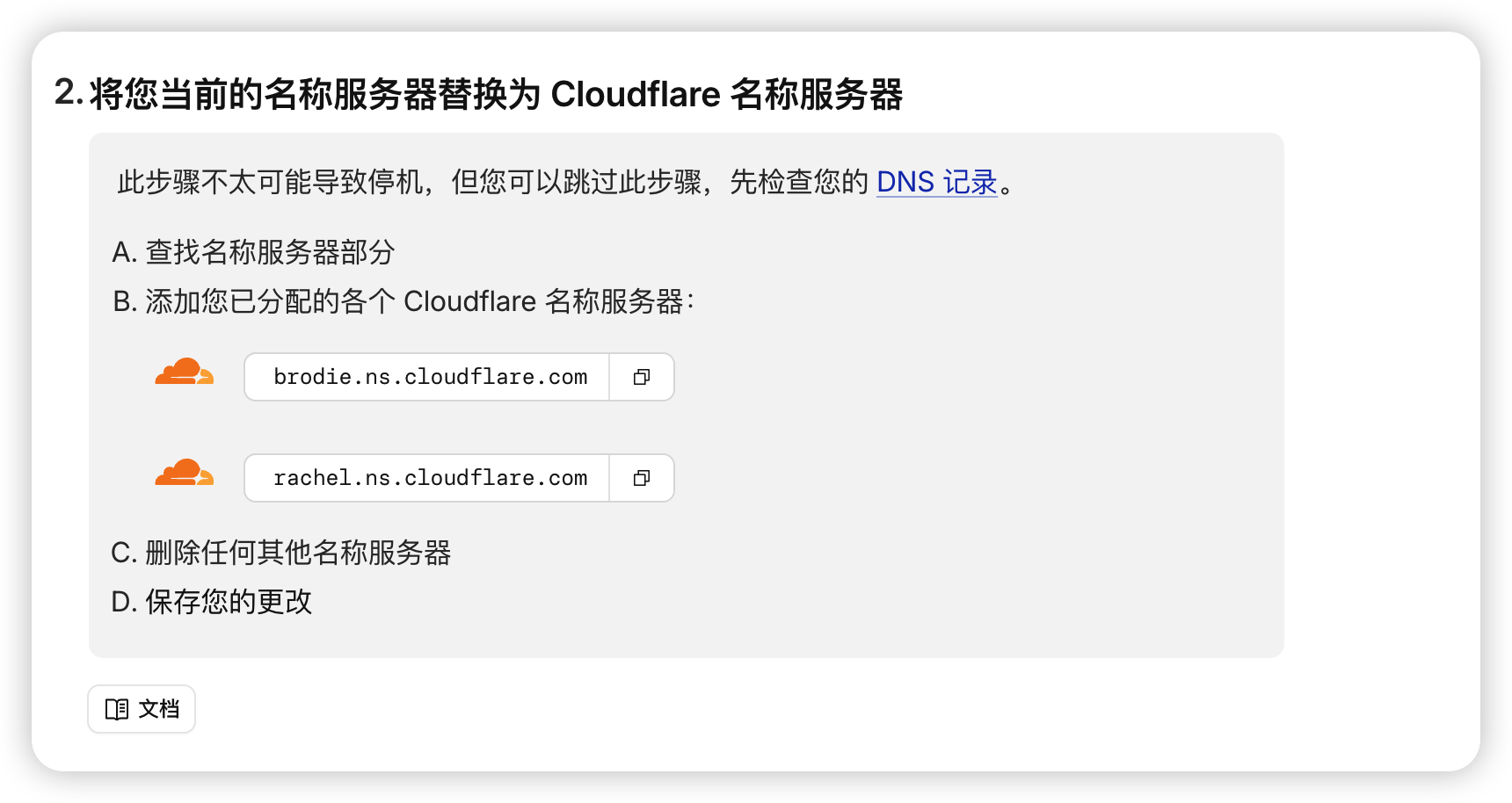 复制cloudflare生成的DNS 填写到注册域名名称服务器哪里填入对应的DNS地址。