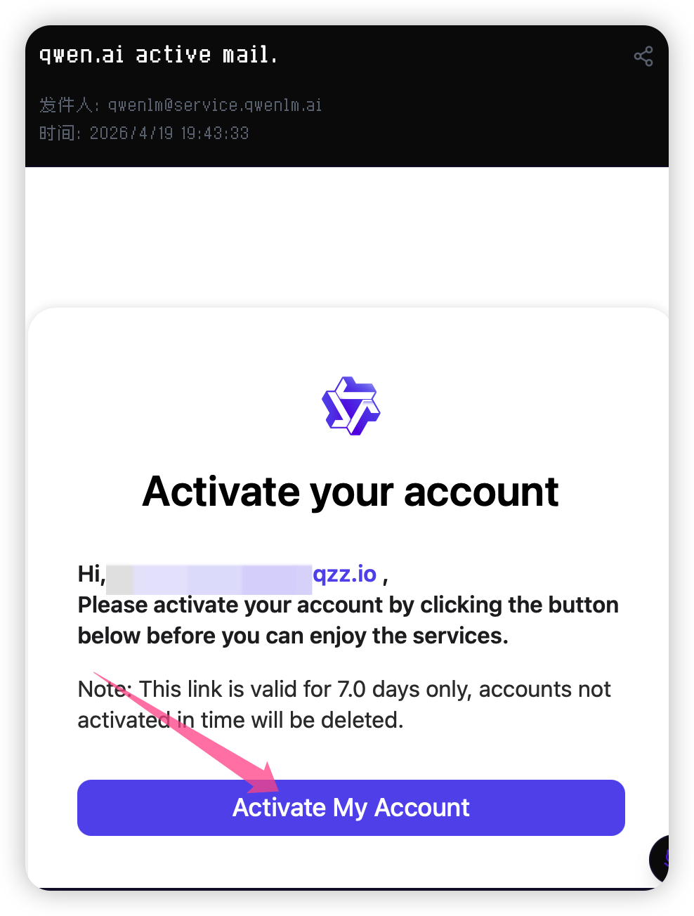 收到了邮件,说明可以正常使用了,点击激活qwen账号。
