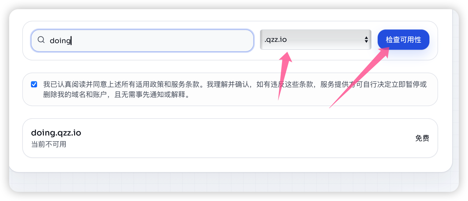点击检查可用性,已经被注册的子域名是不可以再次注册的,记得同意用户协议。