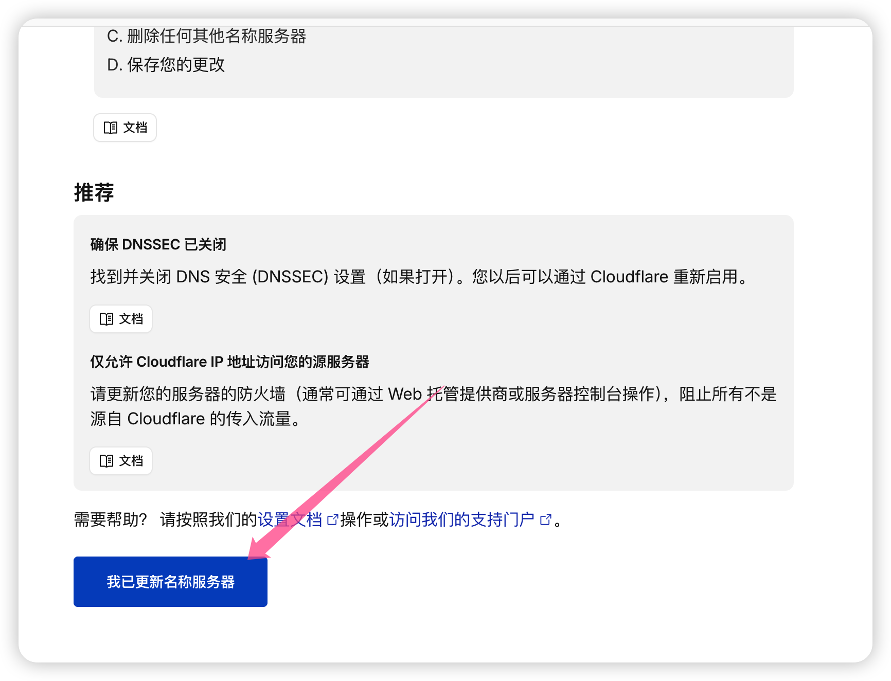 回到 Cloudflare,点击底部我已更新名称服务器,接下来,就只需要等待很短的时间,一般为 3-5 分钟添加托管到 Cloudflare 的域名就会生效。