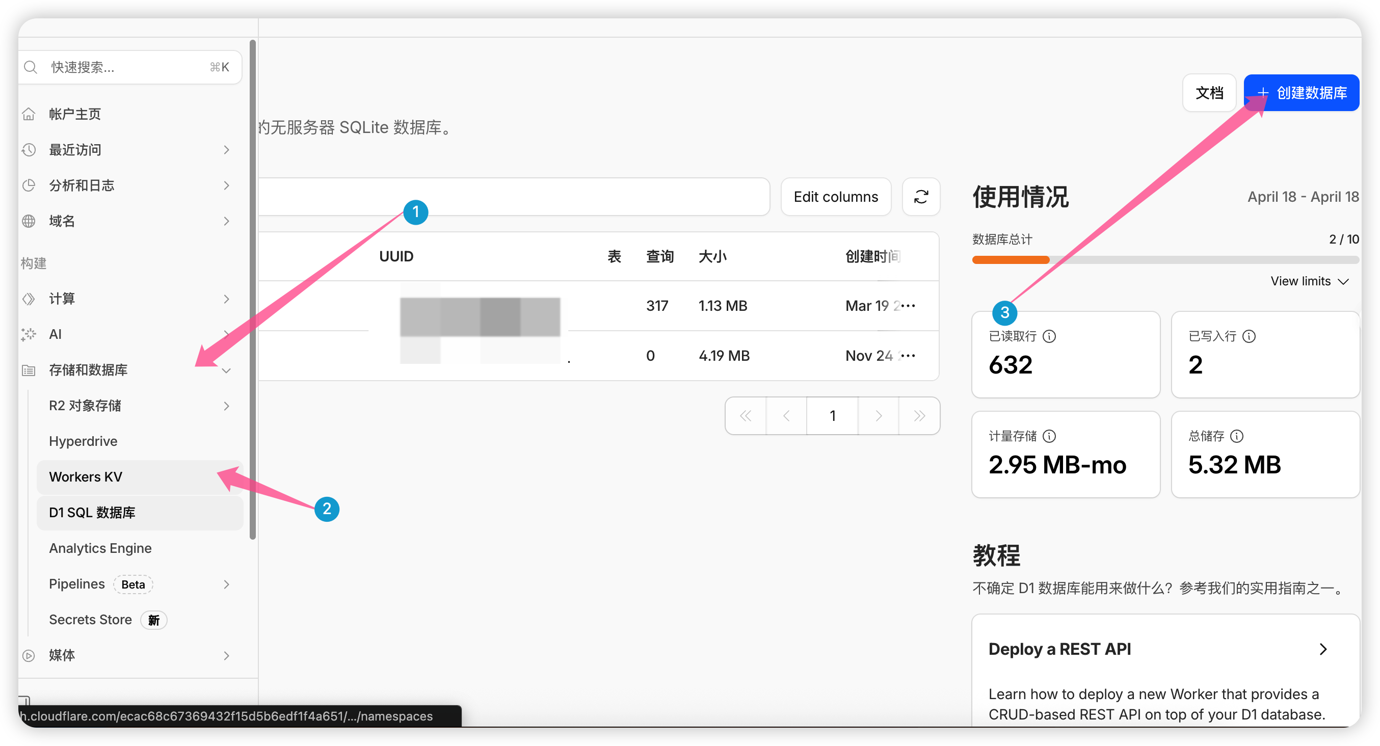 登录Cloudflare 控制台 →“存储与数据库” → “D1 SQL 数据库”